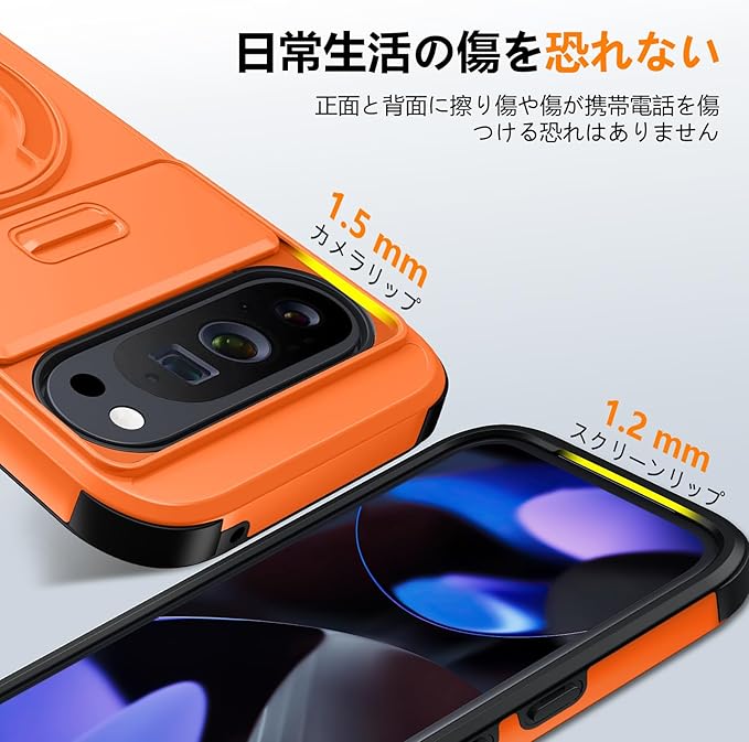 Google Pixel 9 用 ケース リング付き スライド式カメラカバー 隠しスタンド Google Pixel 9 Pro 用 ケース 耐衝撃 スタンド機能 縦横両対応 車載ホルダー PC TPUバンパー 防塵 人気 落下防止 滑り止め 指紋防止 ピクセル 9/ピクセル 9 Pro カバー オレンジ MJJ-1065-05-06
