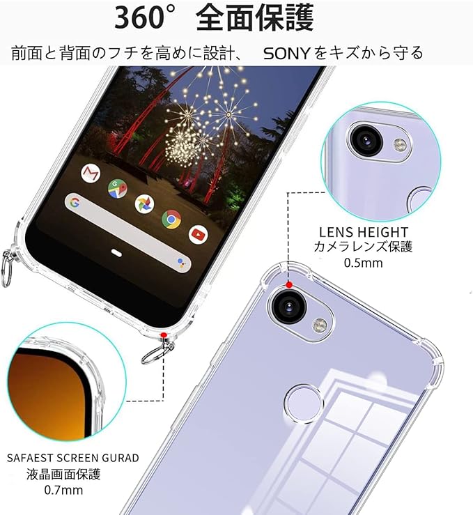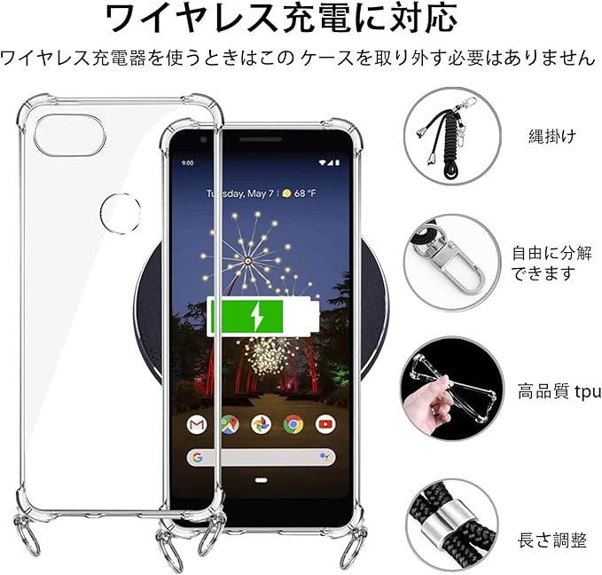 Google Pixel 3a ケース にはとネックストラップが付属します、調節可能なストラップにより、サイド、またはフロントに持ち運べるときに完璧にあなたの隣に掛けることができます。 高透明率の高い特殊なTPU素材を持ち、黄ばみも付きにくい。薄くて丈夫で柔軟性が高く、程よいグリップ感があり、本体の持つスリムさをできる限り損なわないよう設計しています。着脱も簡単で、スマホ本体への擦り傷も心配無用です。衝突や引っかき傷から電話を保護できます。ストラップは、一般的なストラップの1.5倍の厚さで、ストラップを壊さない高品質の強化および厚みのあるナイロン素材で作られています。金具は高品質のステンレス鋼でできており、耐久性が高く錆びません。このアクセサリーはファッションだけでなく、通常のストラップよりも快適で実用的です。 作業、旅行、出張、ショピング、散歩、コンサート、パーティーに最適です。手を離しても、携帯電話を携帯できます。"使いやすさ:柔らかいナイロンストラップで首を快適に保ち、ストレッチの長さを調整でき、ストラップを取り外して、電話ケースを単独で使用できます. ストラップの全長は1.5メートルです.