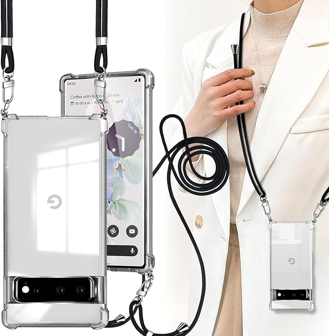 Google Pixel 6 Pro ケース ショルダー クリア Pixel 6 Pro カバー 耐衝撃 TPU 肩がけ 首掛け 紐付き 薄型 縄掛け ケース 斜めかけケース 軽量 取り外し可能 調節可能な ショルダー 肩がけ 首掛け 紐付き 透明+縄掛け-ブラック 08009-PX6pro-03