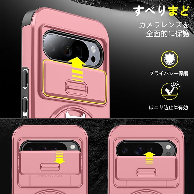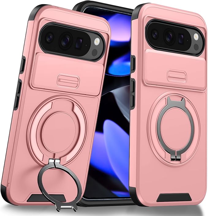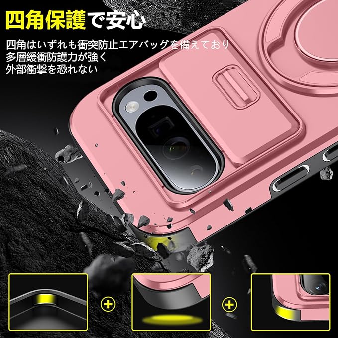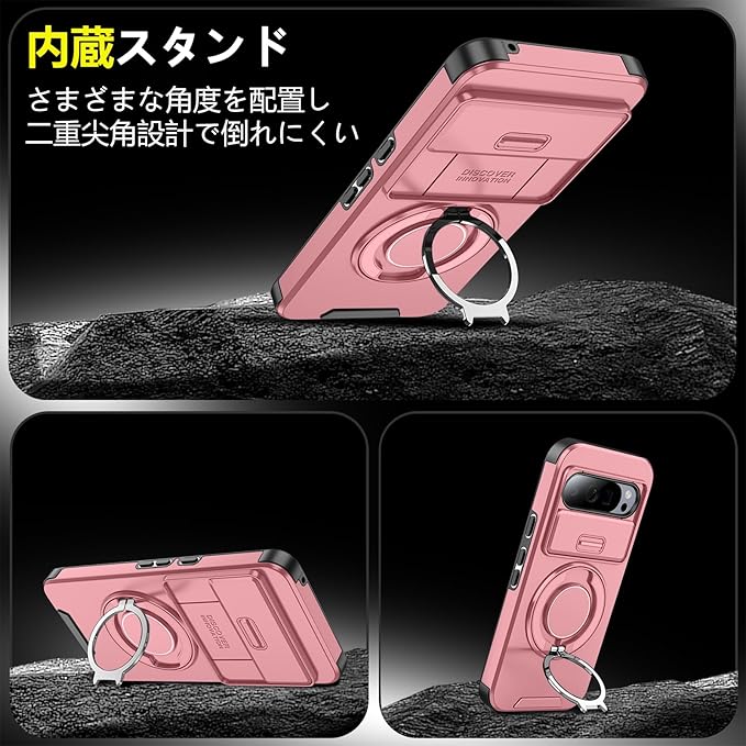 対応 Google Pixel 9 用 Pixel 9 Pro 用 ケース スタンド付き 耐衝撃 レンズ保護 スライドカメラカバー TPU+PC 軽量 滑り止め 落下保護 スタンド機能 車載ホルダー対応 ピクセル 9/ピクセル 9 Pro 携帯ケース ピンク R-LK-Pixel9-9Pro-05