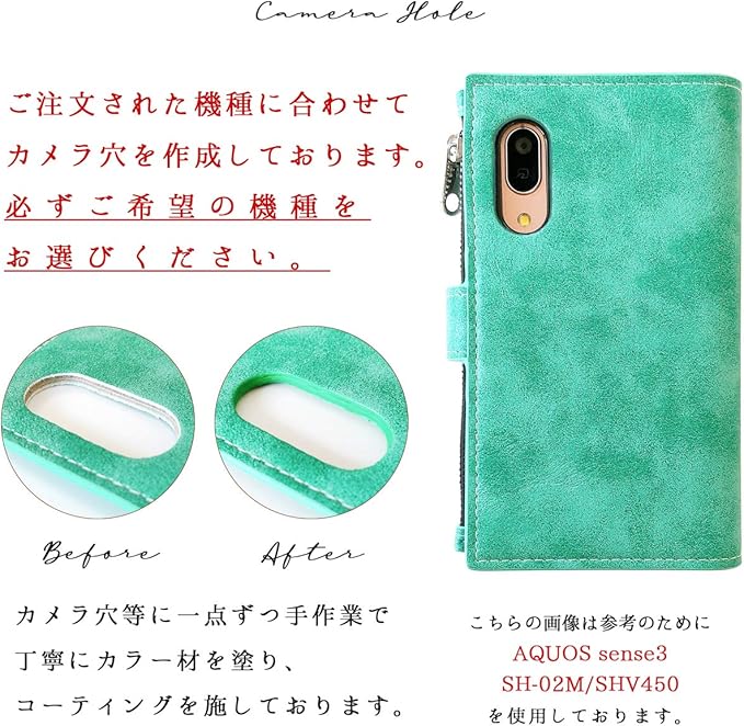 カメラ・指紋認証の開口部には1点ずつ手作業で丁寧にカラー材を塗って、コーティングしております。ストラップ穴があるため、様々なアレンジが可能となります。小銭入れ、紙幣も折って入れられるお札入れとして、ちょっとした現金が必要な場面に対応。カード収納ポケットも付いて、カード決済、スマホ決済、両方使えて便利。小さい財布付きスマホケースでお支払いをよりスマートに。