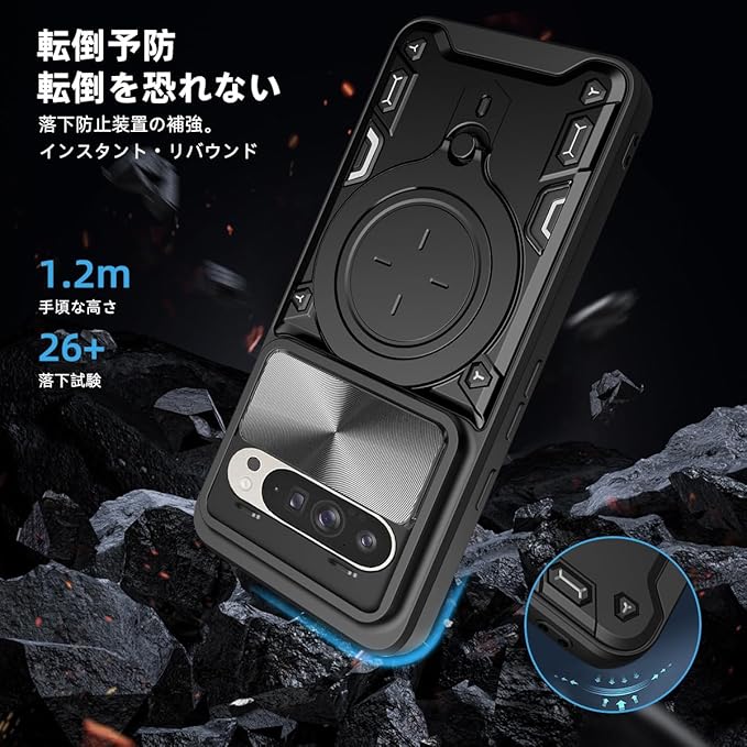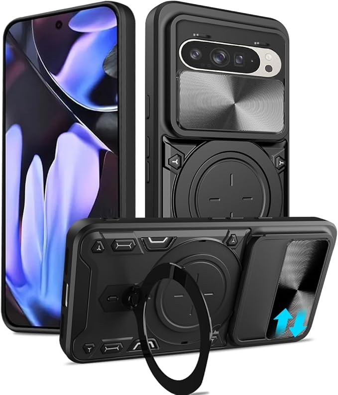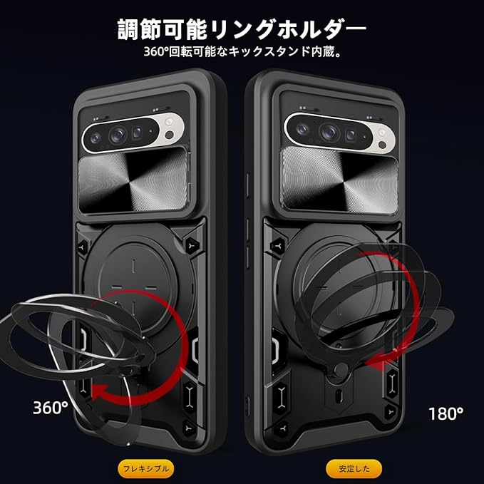 Google Pixel 9/Pixel 9 Pro 用 ケース+360 回転リング 隠し収納式 多機能一体 スタンド付き 携帯ケース 米軍MIL規格取得 耐衝撃 吸収 Case Cover ピクセル9/ピクセル9Pro 背面 カバー レディース メンズ(ブラック)