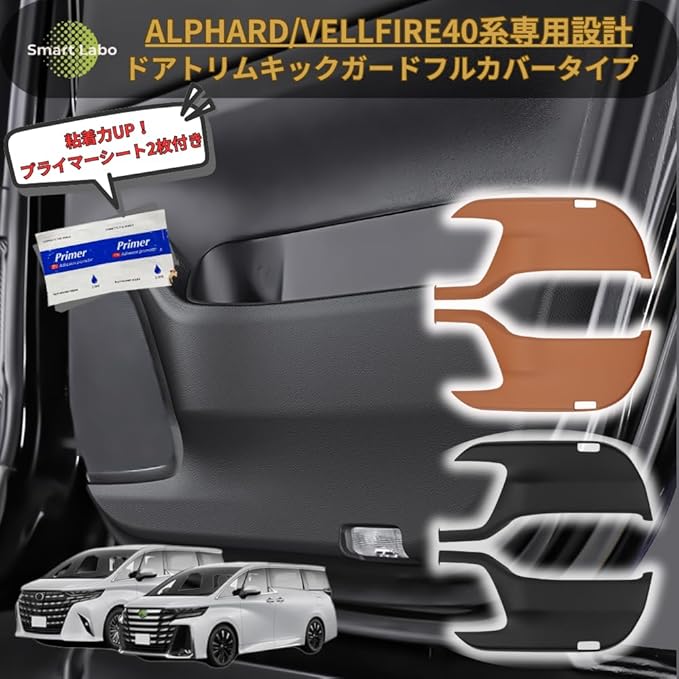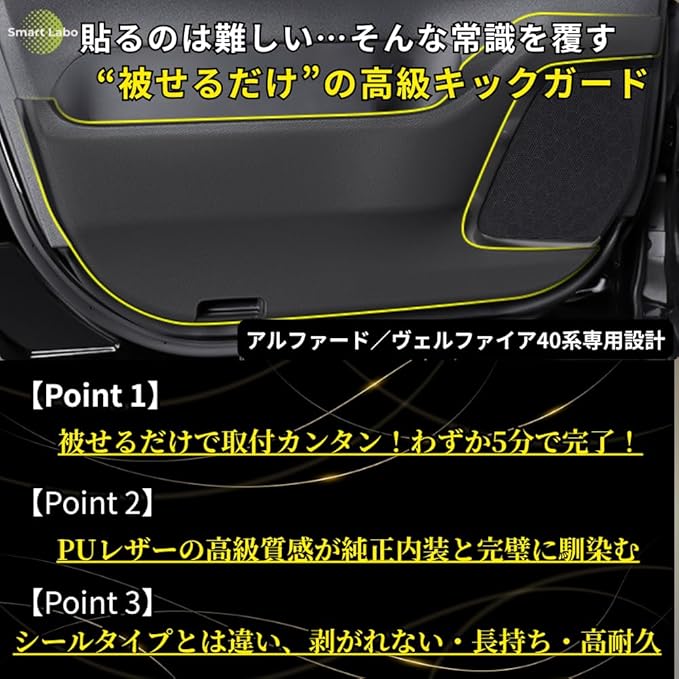 【国家整備士監修・安心トータルサポート】アルファード 40系/ヴェルファイア 40系 専用 キックガードカバー フルカバータイプ ブラック PL保険加入済 動画解説 高級PUレザー 防汚 防傷 強力両面テープ 簡単取付 内装ドアトリム保護 2023年6月~現行対応 実車装着テスト済 (適格請求書対応)