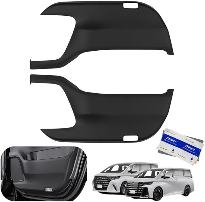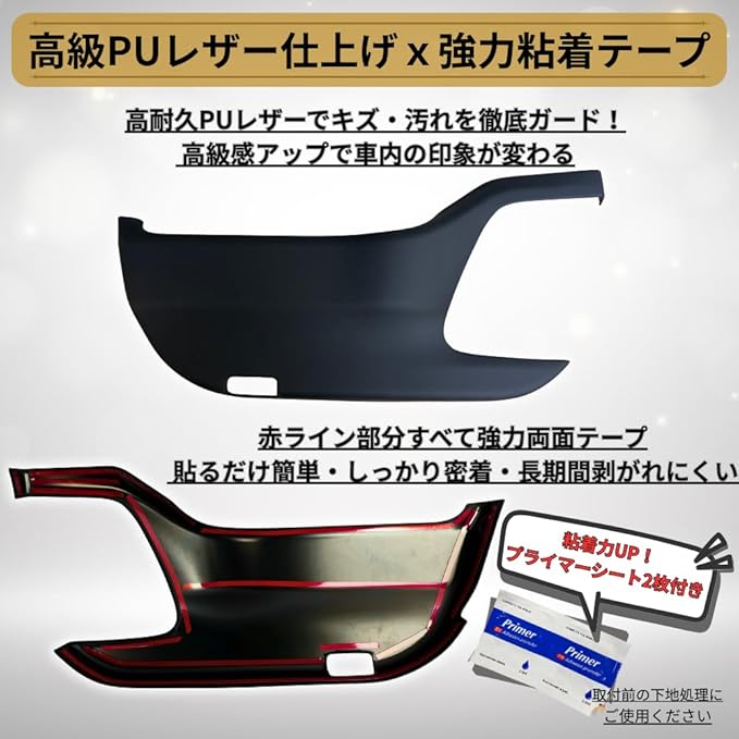 【素材・構造】 高耐久PUレザー採用。 防汚・防傷性に優れ、乗降時のキズ・靴汚れからドアトリムを広範囲で保護。 裏面には強力両面テープを全面配置し、長期間剝がれにくく安定した密着を維持。