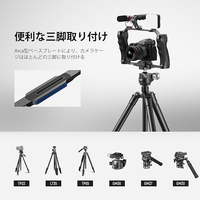 【便利な三脚取り付け】Arca型ベースプレートを介して、カメラケージはNEEWER LT35/TP22/TP65三脚、GM27/GM30/GM36三脚ボール雲台、15mmロッドクランプ付きSR006ベースプレート、およびその他のデバイスに取り付けることができます。コンパチブル スモールリグ。