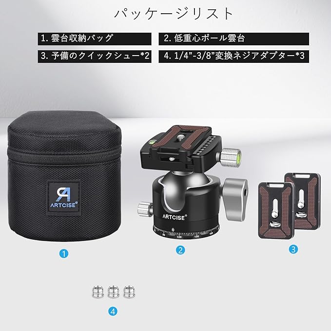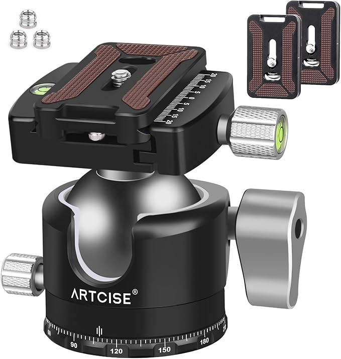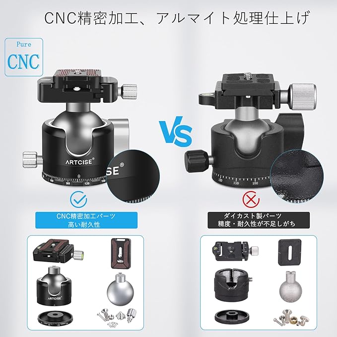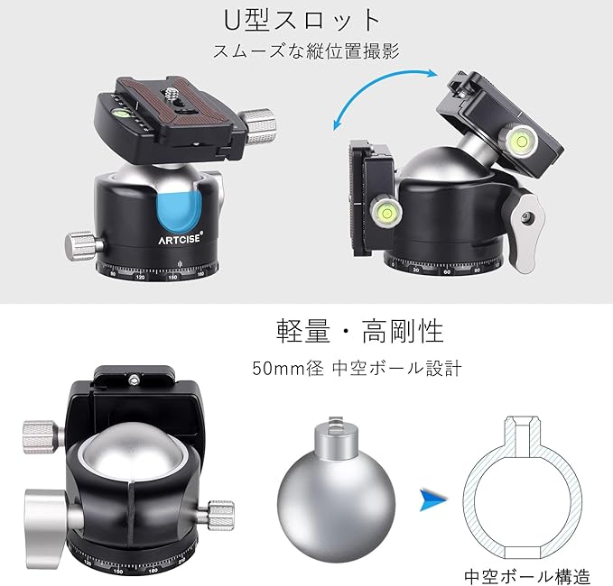 ARTCISE 50mm 低重心 ボール雲台 軽量 CNCアルミ三脚雲台 Arca-Swiss互換 クイックリリースプレート U型スロット搭載 高耐荷重 水準器付き 予備プレート付