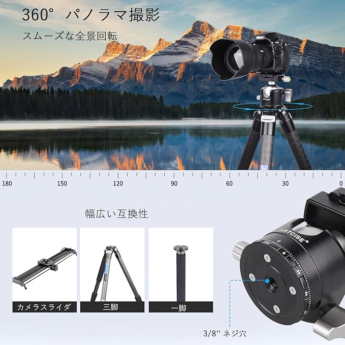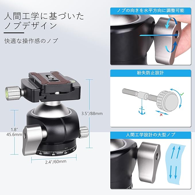 低重心設計による高い安定性 本製品は50mm大型ボールを採用した低重心ボール雲台です。 カメラを三脚に近い位置で支えることで、振動を抑え、 重い機材使用時でも安定した撮影を可能にします。 高耐荷重とスムーズな操作性 精密CNC加工されたボールと内部構造により、 滑らかな操作感と確実な固定力を両立。 構図調整からロックまでストレスなく行えます。 軽量・高剛性アルミ合金ボディ 中空ボール構造と肉抜きクランプ設計により、 強度を保ちながら軽量化を実現。 持ち運びやすく、屋外撮影や旅行にも最適です。 U型スロットで縦位置撮影対応 U字型スロットにより、カメラを素早く縦向きにセット可能。 ポートレートや縦構図の撮影がスムーズに行えます。 高い互換性と便利な付属品 Arca-Swiss互換クイックリリースプレート、 1/4インチカメラネジ、3/8インチ三脚ネジ穴を装備。 さらに予備プレート2枚と変換ネジ3個が付属し、 複数機材の使い分けも快適です。 プロカメラマンからハイアマチュアまで、 安定性・軽量性・操作性を重視する方におすすめのボール雲台です。