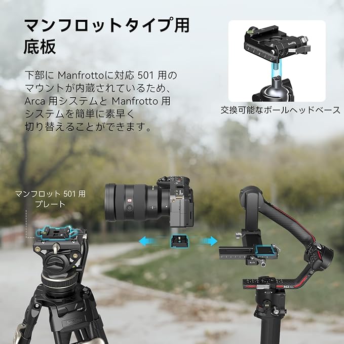 【2つの取り付けポイント】さらに、マンフロットタイプのプレートの底部に1/4"-20および3/8"-16のネジが含まれており、他のアクセサリーで簡単に拡張できます。