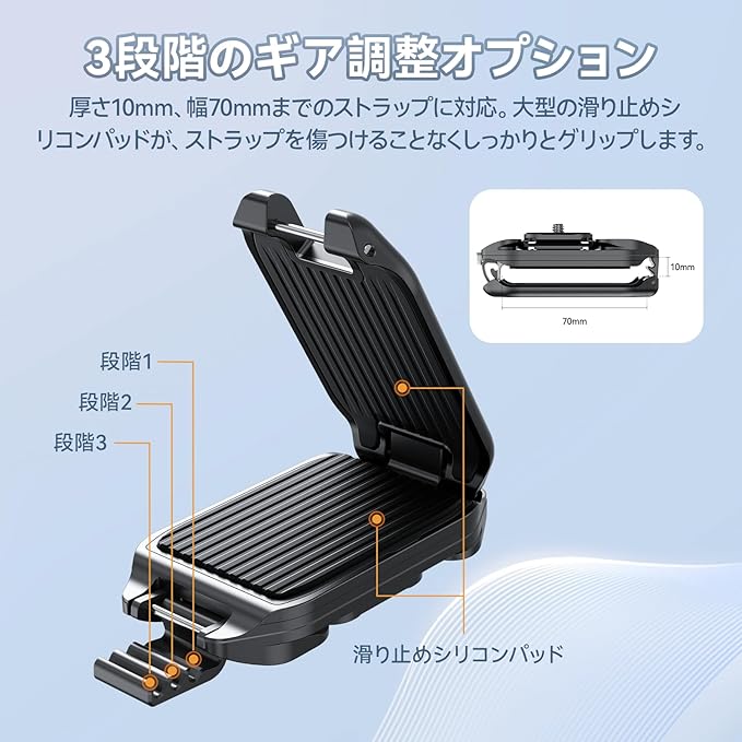 【幅広い適応性】バックプレートは3段階に調節可能で、2mm~10mmの厚さのストラップに対応し、ほとんどのストラップのサイズに適しており、異なる厚さのストラップのクランプに対応できます。 クイックリリースプレートは1/4’’ネジがあります。プレートにはMaglinkショルダーストラップとリストストラップ用の穴が4つあります。*アルカ規格に対応するのはプレートであり、キットのベースではありません。