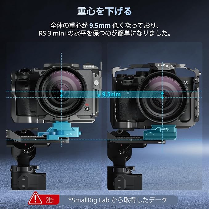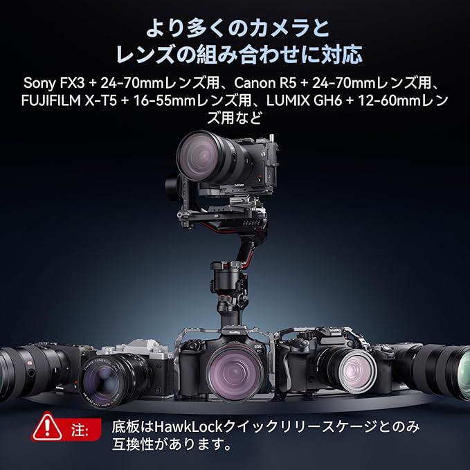 【低重心化】全体の重心が9.5mm低くなり、RS 3 mini用上で水平を保つのが簡単になりました。より重いカメラにも対応可能で、例えばSony FX3 + 24-70mmレンズ用、Canon R5 + 24-70mmレンズ用、FUJIFILM X-T5 + 16-55mmレンズ用、LUMIX GH6 + 12-60mmレンズ用など、すべてRS 3 miniに取り付けることができます。