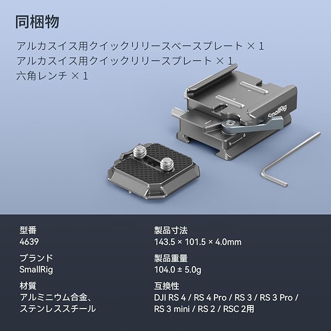 【DJIスタビライザー用の場合】アルカ用クイックリリースプレートは、DJI RS 4 / RS 4 Pro / RS3 / RS 3 Pro / RS 3 mini / RS 2 / RSC 2用に特別に設計されています。底部にArca用 H38 クイックリリースプレートが付いたカメラケージは、SmallRig 4639に直接スライドできます。例: SmallRigケージSony A7R V/A7 IV/A7S III/A7R IV/A1用- 4481。
