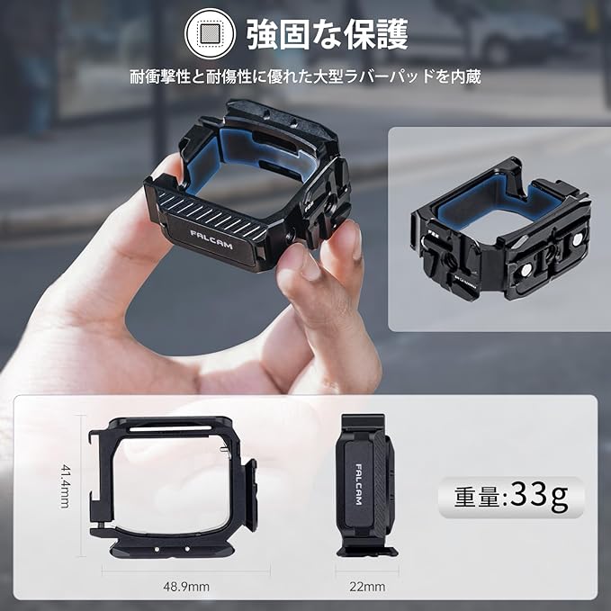 【幅広い互換性】多機能ケージには6種類のインターフェースがあります。F22クイックリリース、Actionマグネットインターフェース、アルカスイス互換、3種類のクイックリリース方式を装備。コールドシュー付き、ライトやマイクなどのアクセサリーも取り付け可能。また、サイドにはGoproのインターフェースと1/4ネジ穴があり、三脚に適応できるだけでなく、GOPRO用のほとんどのアクセサリーとを使用することができます。マグリンク・ショルダーストラップに対応ための穴も付き。