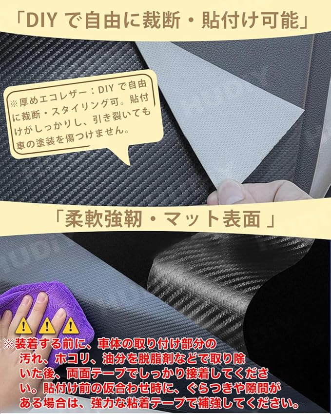 【高品質素材採用】耐衝撃性と曲げ耐久性に優れた上質 PU レザーを使用し、ドアシル装飾ストリップにはカーボンファイバービニールを採用しています。強力な接着剤がしっかり固定するだけでなく、剥がす際にも車体塗装に粘着残りが残らず、塗装面を傷つける心配が少ないです。