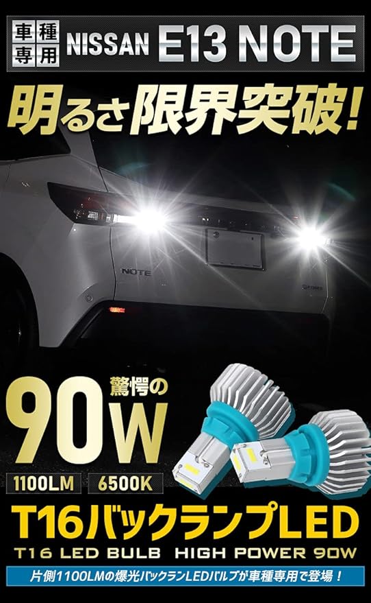 T16 90W ノート/オーラ E13 e-POWER バックランプ LED 無極性 BULB 2個1セット 6500K ヒートシング放熱 車検対応 カスタム パーツ アクセサリー ドレスアップ E13 NOTE T16 90W