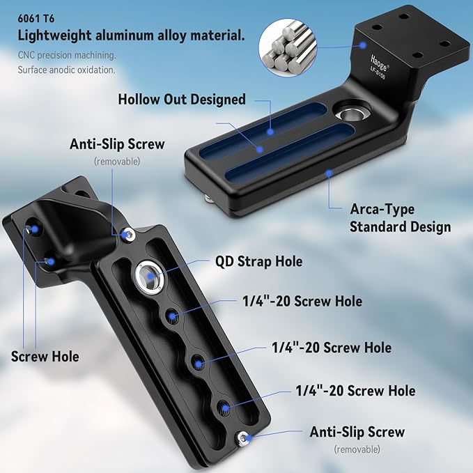 伸縮性のあるarca-compatibleのボールヘッド、クランプ、またはパノラマヘッドに溝があり、ご利用のレンズを標準搭載。