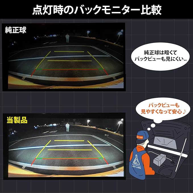 優れた視認性と安全性能: バック時の障害物や歩行者をクリアに視認でき、他車からの視認性が大幅に向上することで接触事故のリスクを低減します。バックモニターの映像がより鮮明になり、周囲からの認識が格段に向上し事故防止に貢献します