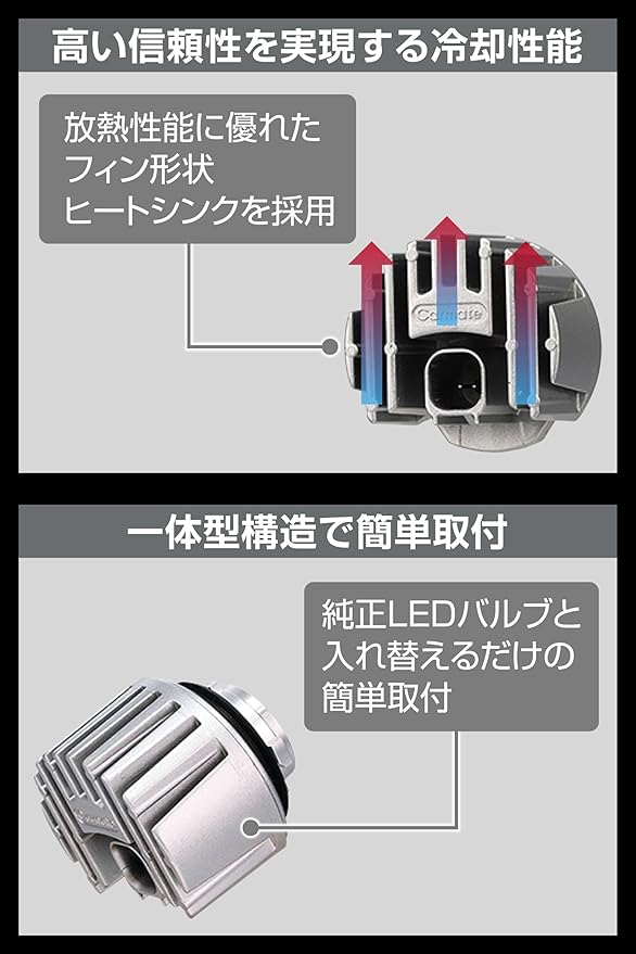 本製品は純正バルブと同サイズながら、優れた放熱性能を誇る独自のフィン形状ヒートシンクを採用。ヒートシンクに溜まった熱を素早く放熱することに成功しました。