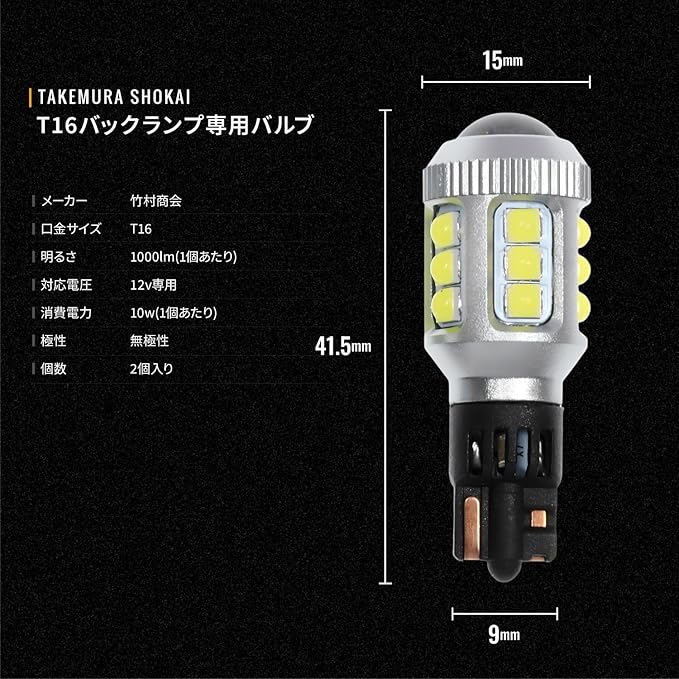 T16 LED バックランプ 12v 6500k 爆光 車検対応 後退灯 2個セット ホワイト T16