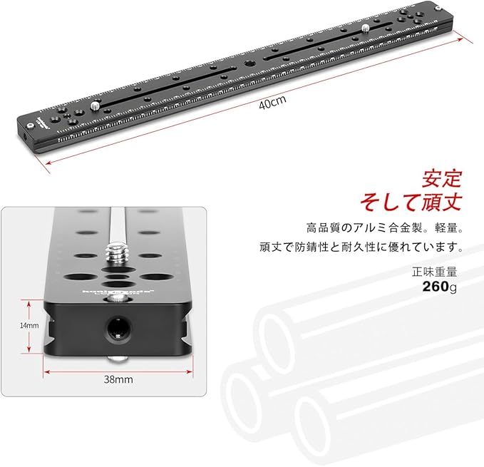 長さ400mmのレールプレート、複数の1/4インチネジ穴付き、他の機器を取り付けることができます。