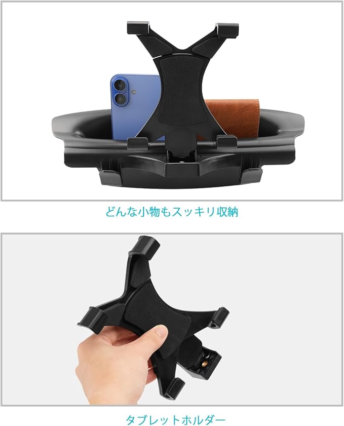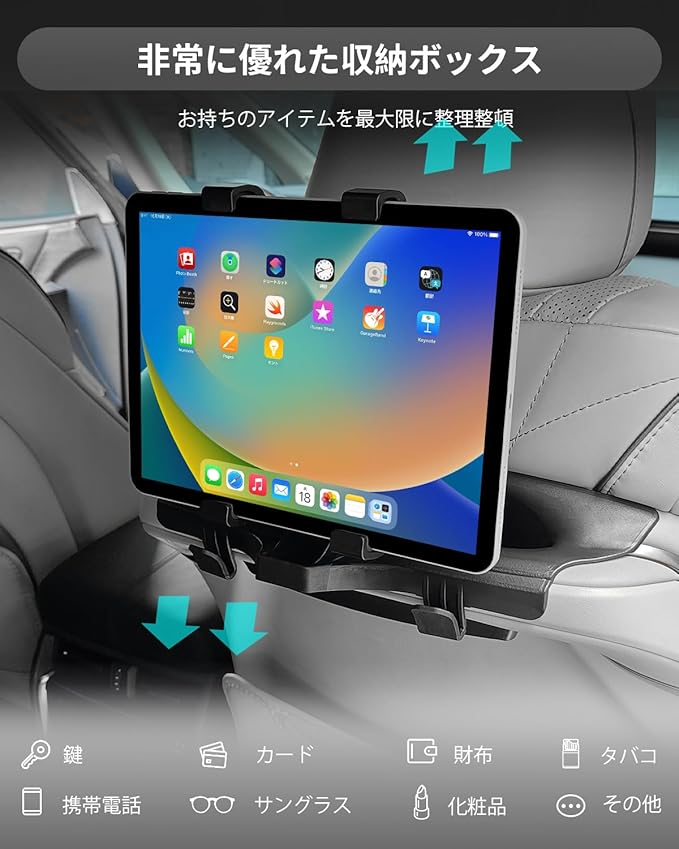 2.【収納&ホルダー一体型】車の座席後ろに取り付け可能な収納ボックスとタブレットホルダー。後部座席の空間を有効活用し、小物の整理整頓ができます。さらに、便利な大きなタブレットホルダー付きで、長時間のドライブ中でも後部座席の乗客が快適に動画や映画を楽しめます。収納とスタンド機能を兼ね備えた一石二鳥のアイテムで、車内をより快適に!