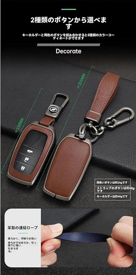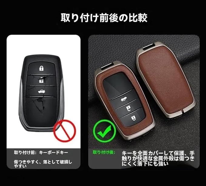 【適合車種・幅広く対応の高級本革スマートキーケー】 プリウス60系/80系 /クラウン・スポーツ/ヤリス10系/ヤリスクロス10系/新型アクア/GRカローラ/GRヤリスに対応。 ※キー形状が同一であれば、その他の車種にも装着可能です。ご購入前に必ずお手元のキー形状をご確認ください。のスマートキーにぴったりフィットする本革キーケース。軽量で簡単に取り付けられます。 【高級本革 亜鉛合金フレーム】 RAV4 キーケースとして人気の本革レザーを使用。 亜鉛合金製メタルフレームと組み合わせ、 薄型・軽量ながら高級感のある仕上がりです。 【全包保護・傷防止】 スマートキー全体を包み込むフルカバー設計。 日常使用による擦り傷や、落下時の衝撃から 大切なキーをしっかり保護します。 【電波干渉なし】 スマートキーの電波を妨げない構造設計。 ケース装着後も、施錠・解錠・バックドア操作などが スムーズに行えます。 【ご購入前のご注意】 2ボタン・3ボタン両対応ですが、 車種・年式・グレードによりキー形状が異なる場合があります。 ご購入前に必ず掲載画像のキー形状をご確認ください。 ※本商品はキーケースのみで、純正キー本体は付属しません。