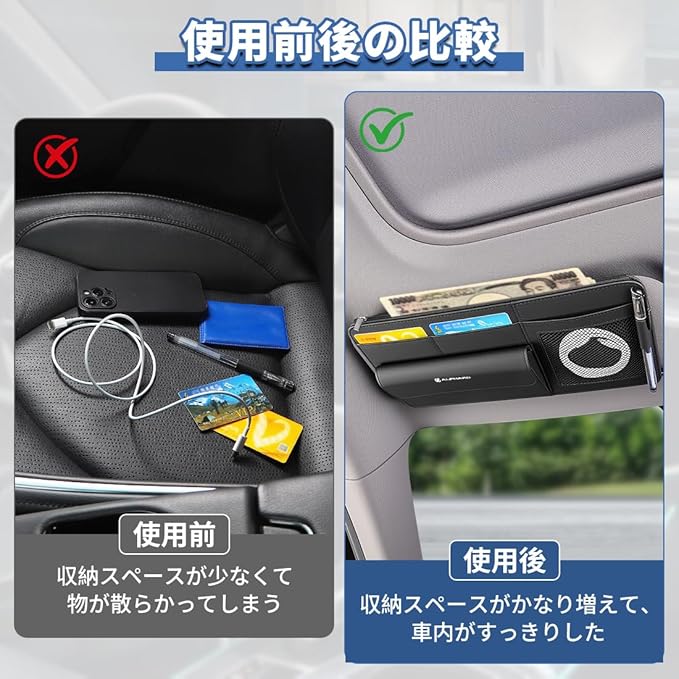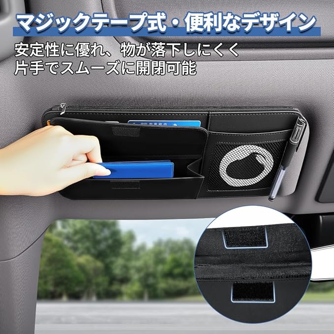 【マジックテープ式 落ちにくい】この車用サンバイザーポケットには、蓋付きの収納スペースがあり、領収書や運転免許証などの小物を整理するのに最適です。蓋付きのデザインなので、中に入っている小物が汚れたり、傷ついたりする心配がありません。マジックテープを使った開閉機能があるため、強い粘着力を持ち、小物が落ちにくく、安心して収納できます。さらに、小型の度付き眼鏡も収納可能なので、購入前にサイズを確認してください。