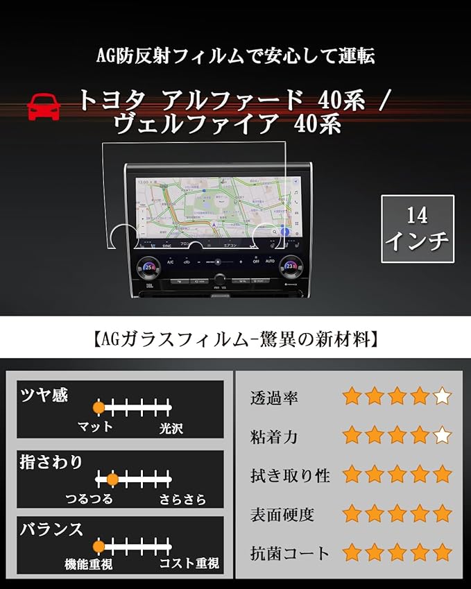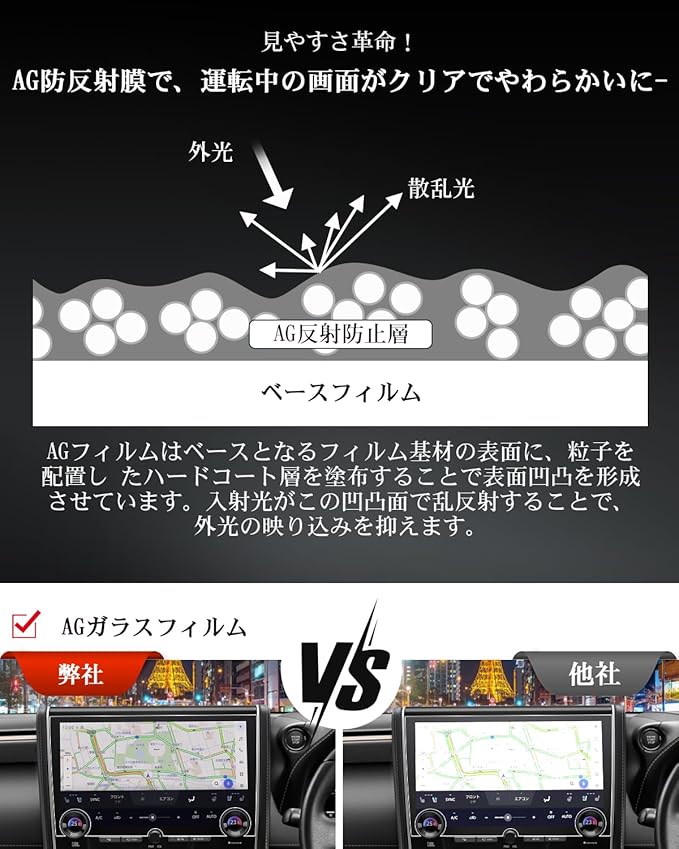 【もう眩しさに悩まない!AGフィルムがあなたのナビを守る】アルファード40系 AG防反射膜は、強い日差しや車のヘッドライトによる眩しさを効果的に軽減することで、40アルファード運転中の安全性を大幅に向上させます。アルファード40系 ナビ 保護フィルムは、光を均等に散乱させる特殊な磨砂加工が施されており、強い光が直接画面に反射するのを防ぎます。結果として、40系アルファードナビゲーション画面はいつでもクリアに見え、運転中の情報確認が容易になります。ドライバーがより快適に、そして何よりも安全に運転に集中できる環境を提供します。