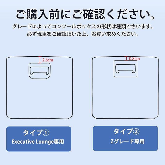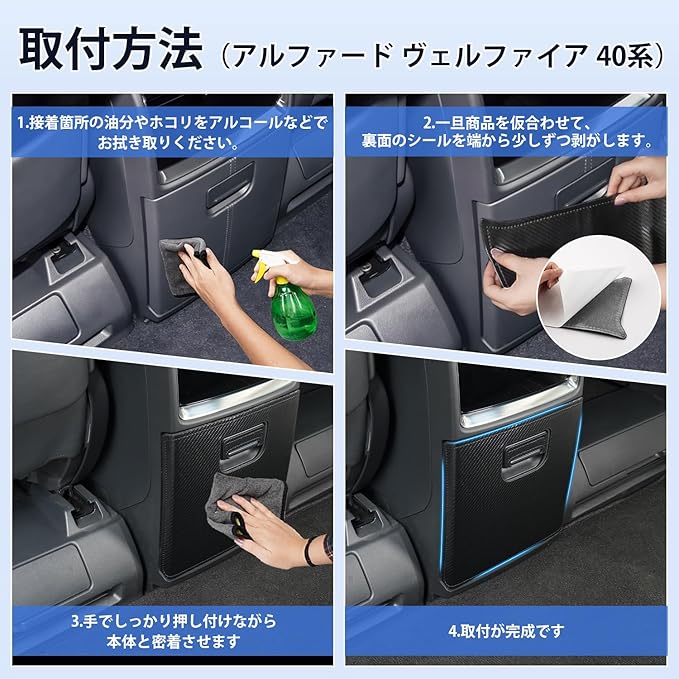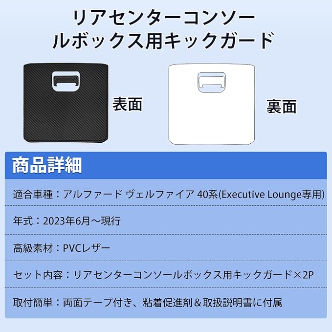 1.【適合車種】:①アルファード40系(4代目) 型式:AGH4#W/AAHH4#W/AAHP45W型 年式:2023年6月21日~現行 ②ヴェルファイア40系(3代目) 型式:TAHA4#W/AAHH4#W/AAHP45W型 年式:2023年6月21日~現行 【セット内容】:リアセンターコンソールボックス用キックガード 2PCS。※ご注意:①形状、年式とモデルをご確認頂いた上、お買い求めください。②※この製品はExcective Lounge[ハイブリッド]、Executive Lounge E-Four[ハイブリッド] 上記2つグレードのみ適合いたします。