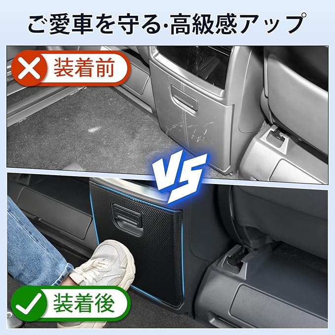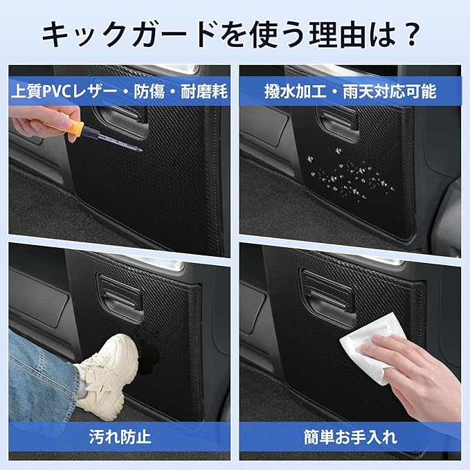 2.【キズや汚れからご愛車を守る】:車に乗っている時、ついてしまうキズや汚れからしっかり保護!完全車種別専用設計のキックガードで、ピッタリ装着で長期使用も安心。気づかないうちについてしまうキズや汚れをしっかりガードし、車内をクールで快適な空間に保ちます。いつもの車内を、より優れたスペースに変えるアイテムです。