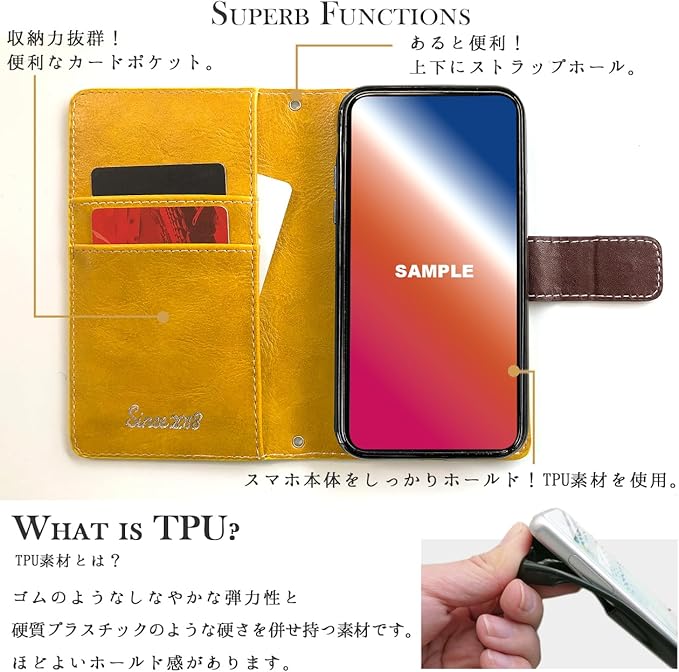 【全面保護】手帳型の全面保護機能でディスプレイ、背面をしっかり保護します。さらにカメラレンズ保護構造でスマホ本体を傷から360度しっかり保護してくれます。