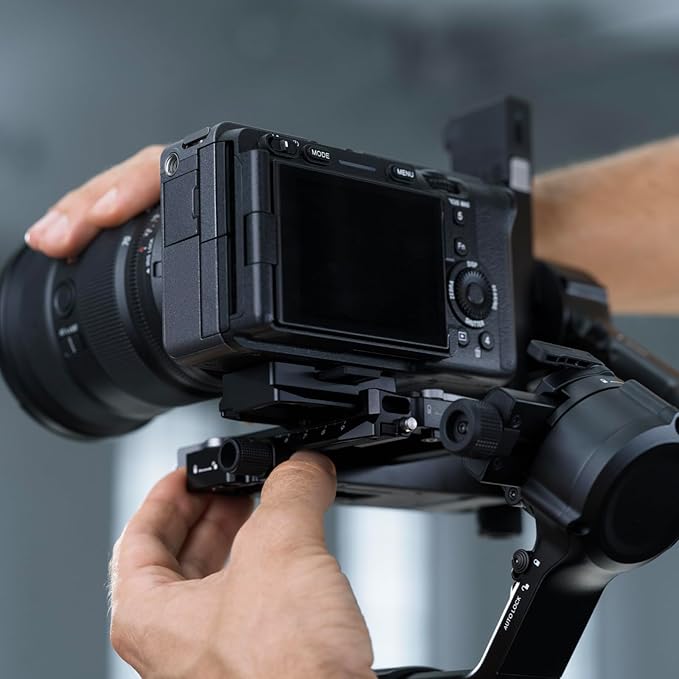 下部クイックリリースプレートは、両側に目盛りがあり、底面には鋸歯状の溝が設けられています。これはジンバルのチルト軸にある微調整ノブを補完するもので、カメラマンがカメラやレンズを交換する際にミリ単位の正確な調整を行うことを可能にします。また、カメラの三脚やスタビライザーの切り替えも素早く行えます。