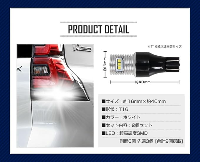 TOYOTA ランドクルーザー プラド 150系 [TRJ/GRJ/GDJ] 専用 T16 LEDバックランプ 45W 2個セット 【圧倒的な光量で後方視認性を向上】超爆光45W 560LM:超高輝度SMD LEDを9基(側面6個・先端3個)搭載。純正球を凌ぐ高い光量を実現。