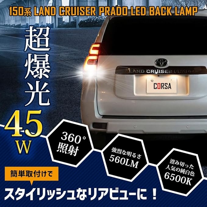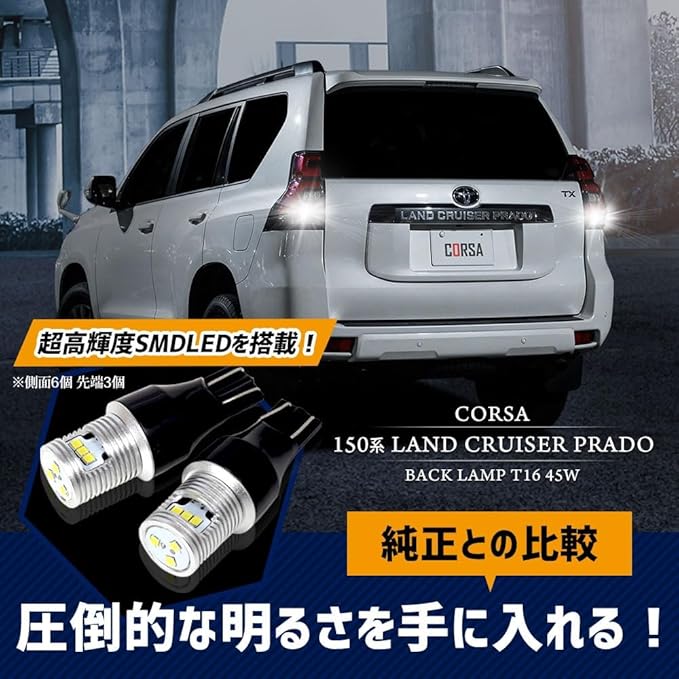 CORSA ランドクルーザー プラド 150系 適合 LED バックランプ T16 45W 2個1セット バックライト 無極性 6500K 150 LAND CRUISER PRADO TRJ GRJ GDJ カスタム パーツ アクセサリー ドレスアップ [2] M
