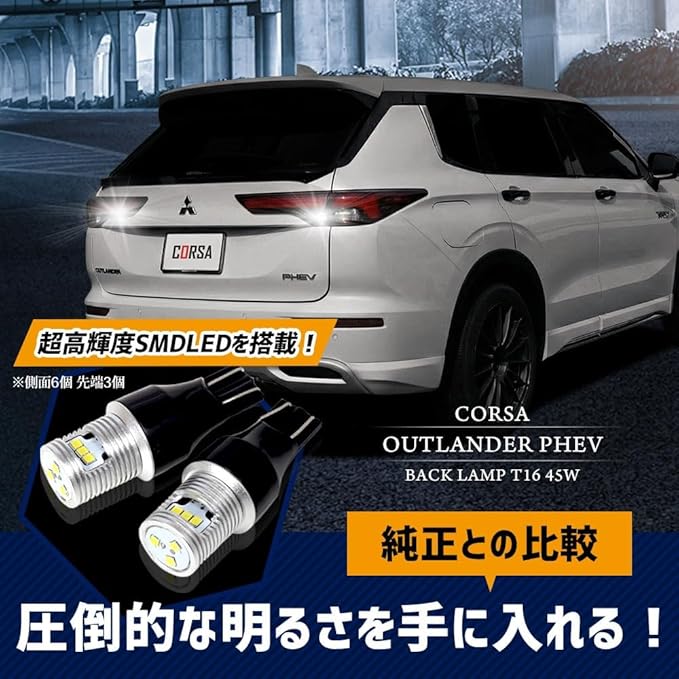 三菱 アウトランダー 専用 T16 LEDバックランプ 45W 2個セット 【圧倒的な光量で後方視認性を向上】超爆光45W 560LM:超高輝度SMD LEDを9基(側面6個・先端3個)搭載。純正球を凌ぐ高い光量を実現。