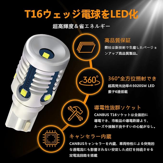 【T16 LED ホワイト 高輝度 爆光】T16バックランプとしか使われません。最先端超高発光効率の3020LED素子6個搭載、360 全方位照射できて、ムラのない美しい光を実現しています。CANBUSキャンセラー内蔵で大部分車種はエラーフリー、12V車用T16バルブ2個セット。