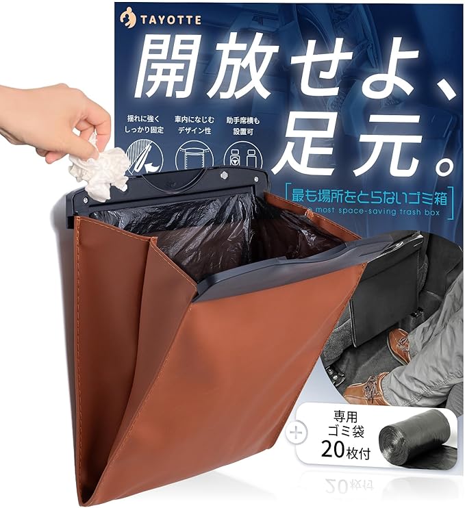 【フック&テープでW固定】 車 ゴミ箱 スリム 《袋20枚付》 車用ゴミ箱 カー用品 ブラウン