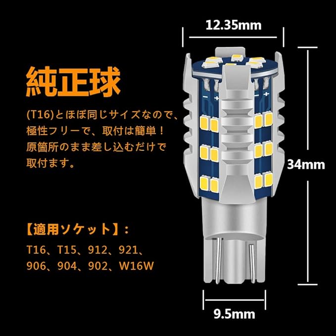 【極性フリー&取付簡単】純正球(T16)とほぼ同じサイズなので、極性フリーで、取付は簡単!原箇所のまま差し込むだけで取付ます。適用ソケット:T16、T15、912、921、906、904、902、W16W。