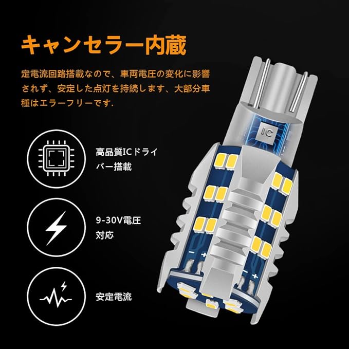 【定電流回路 安定性抜群】インテリジェント定電流回路を搭載。車両電圧変化にも影響されずに安定した点灯を持続します。これによりLEDにかかる負荷をおさえ、より長寿命を実現しております。ハイブリッド車両にも安心してご使用いただけます。ご注意:※全ての車種において動作保証はできません。一部の車種ではキャンセラーが機能しないです。