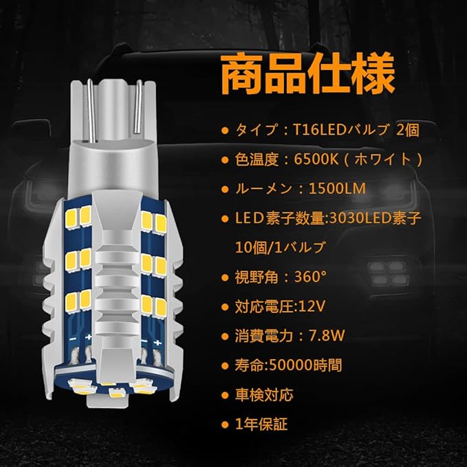 【製品仕様】口金タイプ:t16 led/ 発光色:ホワイト / LEDチップ:2016SMD / LEDチップ数:30連 / 入力電圧:DC9-30V / 電流:0.65A / 消費電力:7.8W / 極性:無極性 / パッケージ内容:LEDバルブ 2。