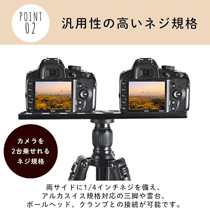 【汎用性の高いネジ規格】両サイドに1/4インチネジを備え、アルカスイス規格対応の三脚や雲台、ボールヘッド、クランプとの接続が可能です。