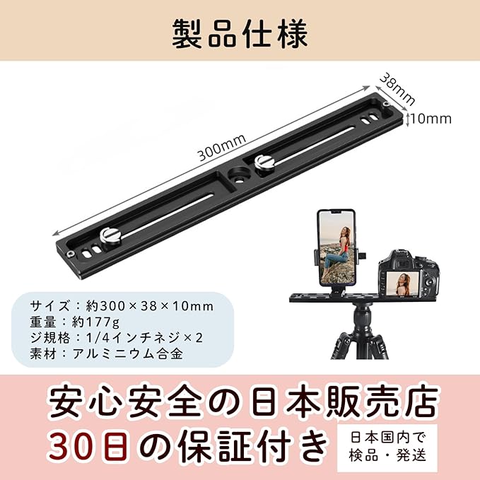 【製品仕様】サイズ:約300 38 10mm、重量:約177g、ネジ規格:1/4インチネジ 2、素材:アルミニウム合金。