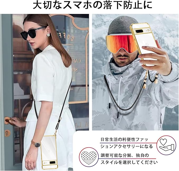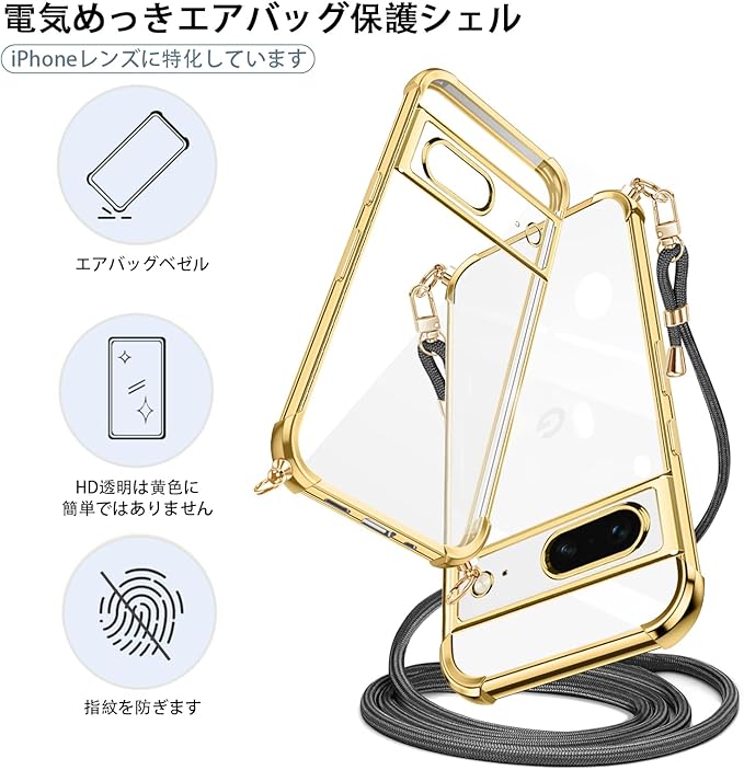 Pixel 8 ケース クリア ショルダー 耐衝撃 グーグル ピクセル 8 スマホケース 薄型 TPU 軽量 肩がけ 首掛け 紐付きバンパー カバー ストラップ付き ストラップホール付き 韓国 透明 ストラップ着脱可 調節 ワイヤレス充電 全面保護 落下防止 すり傷防止 カメラ保護(ゴールド)