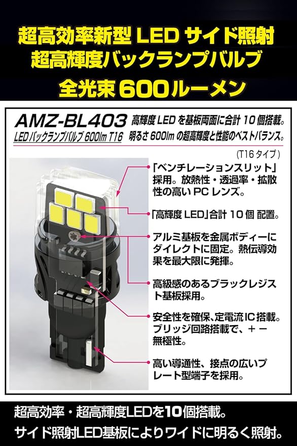 M's Basic by IPF バックランプ LED 車用 T16 600lm 6000K ホワイト 12V用 1本入 車検対応 定電流回路搭載 無極性 高拡散性レンズカット 高輝度LEDチップ採用 AMZ-BL403