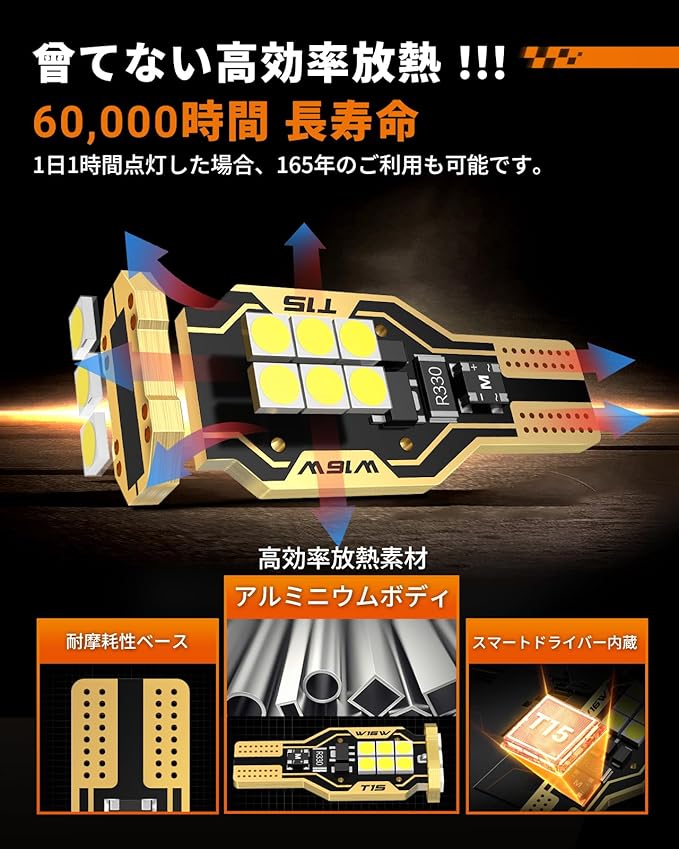【優れた放熱&耐酸化性能アップ】放熱ベースをアップグレードしており、高熱伝導アルミ材質を採用しており、優れた熱伝導性・放熱性を実現します。発熱量をしっかり抑え、灯体への負担をかからず、60000時間の使用寿命を実現し、バックランプ、後退灯、バックライト電球に最適です。