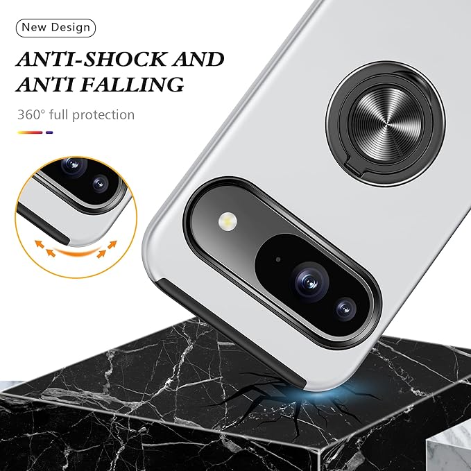 Google Pixel9 用 ケース Google Pixel9 Pro 用 ケース リング付き TPU 耐衝撃 スマホケース 車載対応ホルダー対応 スタンド機能 軽量 薄型 グーグル ピクセル9/9 プロ 用 ケース カメラ保護 衝撃吸収 指紋防止 黄変防止 一体型 四隅滑り止め 手触り良い 保護カバー 銀 SJ15.279