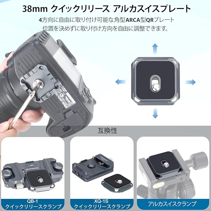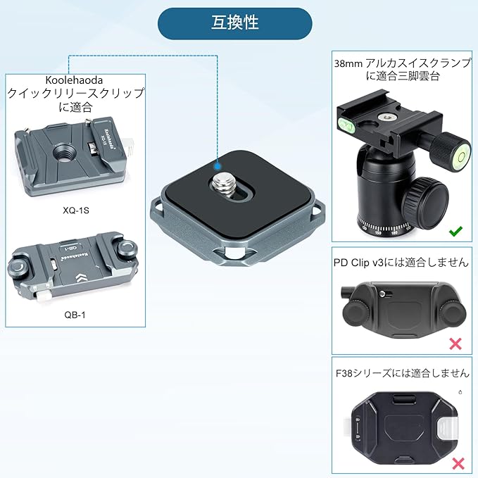 【QB-1/QB-2クイックシュー&アルカスイス対応】:小さなクイックリリースプレートは、Koolehaoda QB-1 バックパックストラップクリップ / QB-2 クイックリリース対応できます。クイックリリースプレートアルカスイス38mm標準で、アルカスイス互換の雲台側パーツ(クランプ)にセットすることができます。