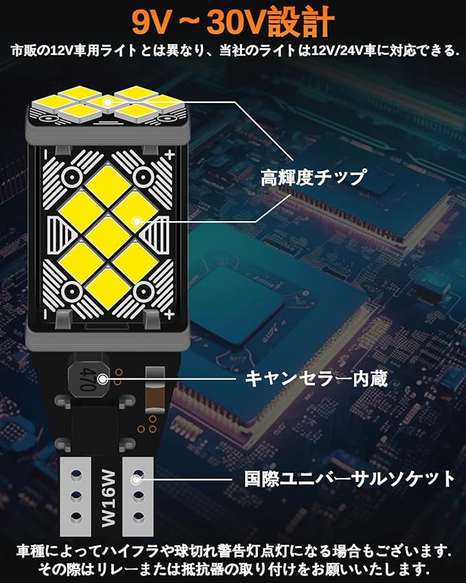 12V/24V兼用:DC9-30V車のバックランプ、ウインカー、ブレーキランプ、テールランプ、ストップランプなどの交換ができます。