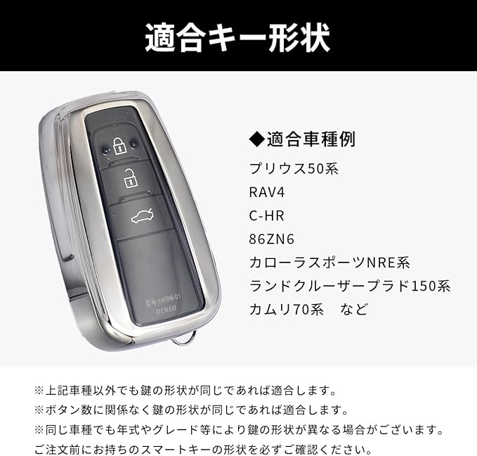 【適応車種】(お使いの鍵の形状をご確認ください) プリウス50系 (2015年12月9日〜) 新型 RAV4 (2019年04月10日〜)※年式によって適合しない場合がございます。 C-HR ZYX10 / ZYX11 (2016年12月〜) トヨタ86 後期型 (2017年10月〜) カローラスポーツ ※年式によって適合しない場合がございます。 カローラツーリング ※年式によって適合しない場合がございます。 カローラセダン (2019年9月) ランドクルーザー プラド 150 後期 (2017年9月〜後期型) 新型 カムリ 70系 (2017年7月10日〜) などに適合。