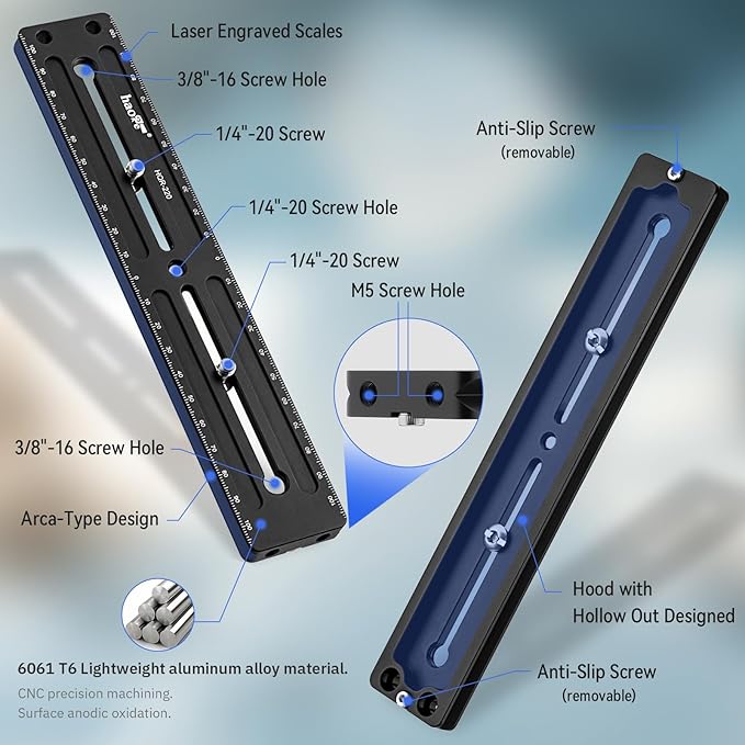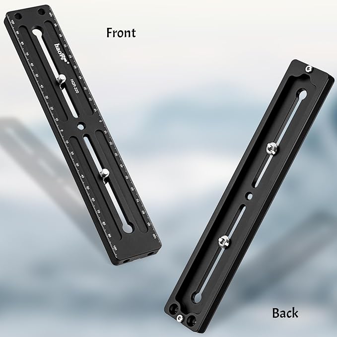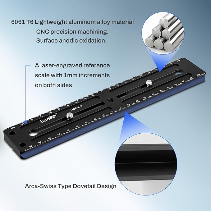 Haoge HQR-220 汎用クイックリリースロングプレートは、アルカタイプに対応する多目的レールで、レーザー刻印された1mm単位の目盛りが両面に付いています。