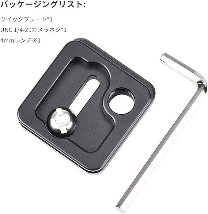 製品に含まれるもの:クイックプレート* 1、カメラネジ* 1、固定ネジ* 2、4mmレンチ* 1、2.5 mmレンチ * 1